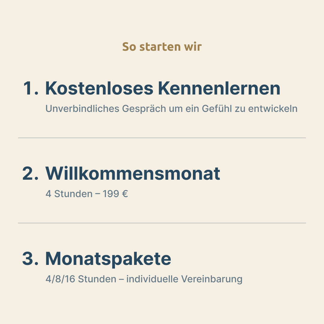 Der Willkommensmonat umfasst 4 Stunden für 199 €. Die Preise für die regulären Monatspakete (4/8/16 Stunden pro Monat) besprechen wir individuell und persönlich.